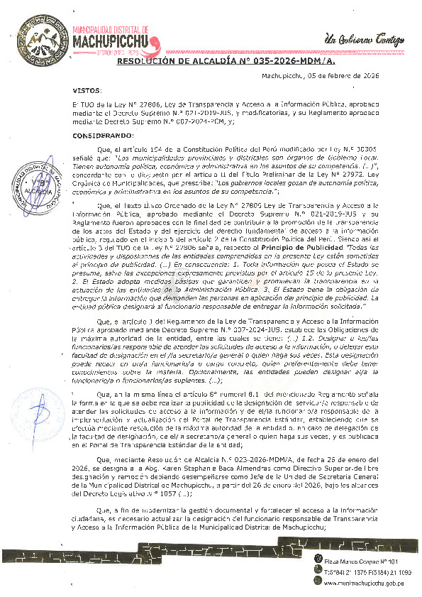 DESIGNAR, a partir de la fecha a la Jefa de la Unidad de Secretaría General, Abg. Karen Stephanie Baca Almendras como FUNCIONARIO RESPONSABLE DE TRANSPARENCIA Y ACCESO A LA INFORMACIÓN PÚBLICA de la Municipalidad Distrital de Machupicchu, de conformidad con lo dispuesto por el T.U.O. de la Ley N.º 27806.
