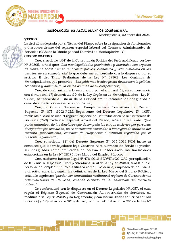 DESIGNAR al ABOG. HUMBER HUILLCA MUELLE, en el cargo de confianza de GERENTE MUNICIPAL de la Municipalidad Distrital de Machupicchu, a partir del 02 de enero de 2026, bajo los alcances del Decreto Legislativo Nº 1057 – Régimen Especial de Contratación Administrativa de Servicios, con el nivel y remuneración que corresponde conforme a ley, hasta nueva disposición.