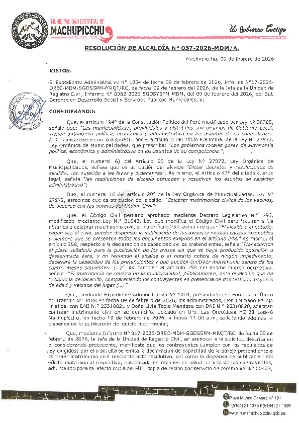 DISPENSAR, la publicación del edicto matrimonial para la realización del matrimonio civil, y en consecuencia DECLARAR, la capacidad para contraer matrimonio civil de los pretendientes Don FELICIANO PAREJA HUALLPA, identificado con DNI N° 25310821, y Doña LIVIA TAPIA MENDOZA, identificada con DNI N° 25310820, conforme a los fundamentos expuestos en la parte considerativa de la presente resolución.
