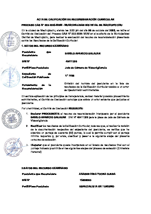 En la ciudad de Machupicchu, siendo las 3:00 pm del día 06 de octubre del 2025, se reúne el Comité de Evaluación del Proceso CAS N° 003-2025-MDM en el auditorio de la Municipalidad Distrital de Machupichu, para realizar la evaluación del recurso de reconsideración presentado contra los Resultados de la Calificación Curricular.