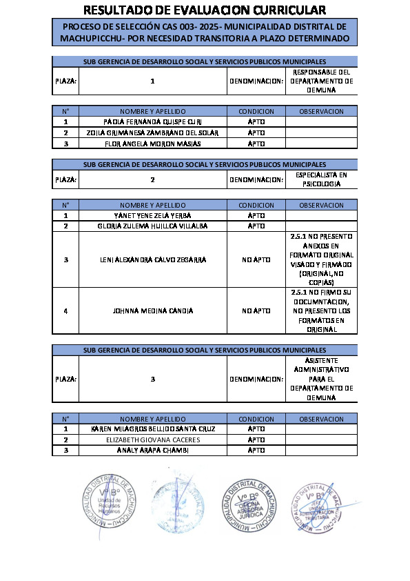 Resultados de evaluacion curricular PROCESO DE SELECCIÓN CAS 003- 2025- MUNICIPALIDAD DISTRITAL DE MACHUPICCHU- POR NECESIDAD TRANSITORIA A PLAZO DETERMINADO